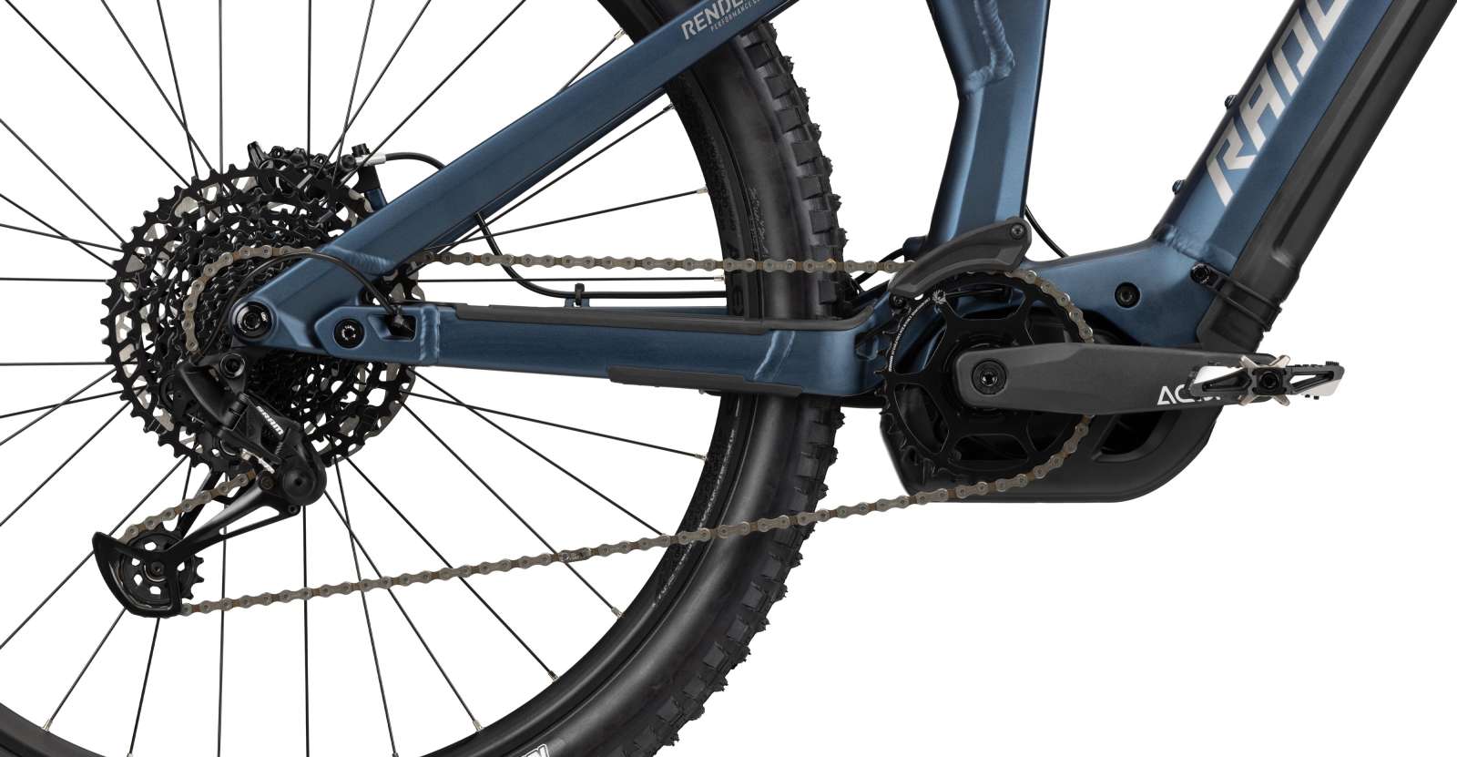Das RENDER AL markiert den Einstieg in die RADON Pedelec Fully-Welt und bietet mit seinem modernen, hydrogeformten Aluminiumrahmen selbst im Einstiegssegment bereits volle Performance auf dem Trail. Der Alurahmen ist solide und dennoch leicht gehalten, aus Gründen der Gewichtsreduzierung entfällt der aus dem Carbon-Bruder bekannte Flügel und wird durch eine deutlich leichtere, schlanke Dämpferaufnahme unter dem Oberrrohr ersetzt. Der formschöne Rahmen nimmt im Unterrohr den 625 Wh Akku auf, der über ein Batteriecover auf der Unterseite leicht zum Laden entnommen werden kann. Alternativ ist der Ladevorgang aber natürlich auch über den externen Ladeport am Sitzrohr mit im Bike verbauter Batterie steuerbar. Die Kabelführung am gesamten Bike ist sehr clean und funktionell, damit keine scheuernden oder klappernden Züge die Freude am Biken trüben. Kinematisch ist das RENDER AL an der bewährten Carbonversion orientiert und wartet mit speziell abgestimmten Federlementen auf.
